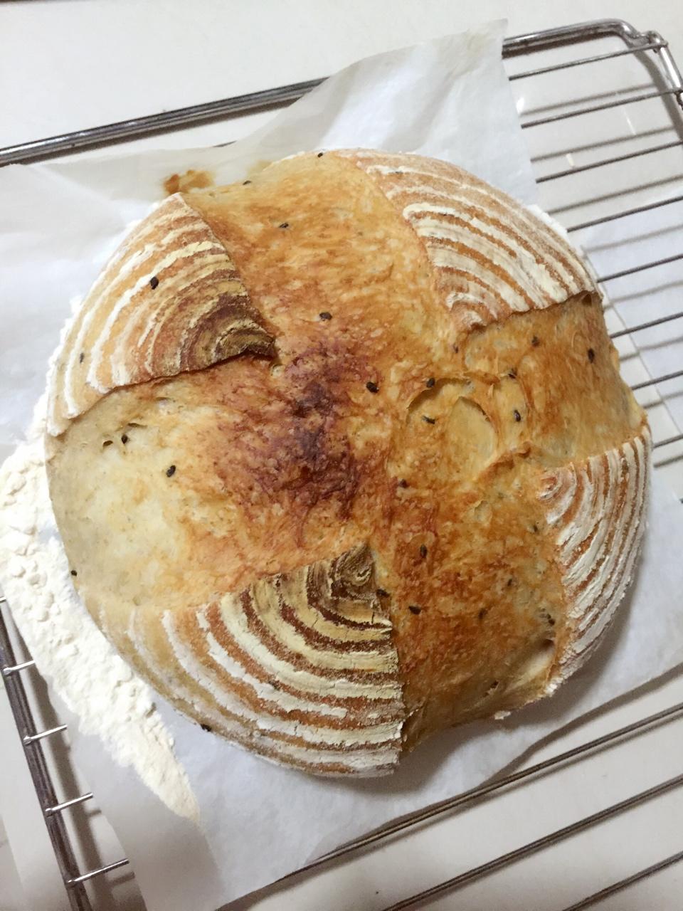 第一个发酵藤篮做的面包,开口还比较满意,没有放糖,做了双倍的量,有50克黑麦粉,还加了一些黑芝麻。表面很脆,中间很软。方...