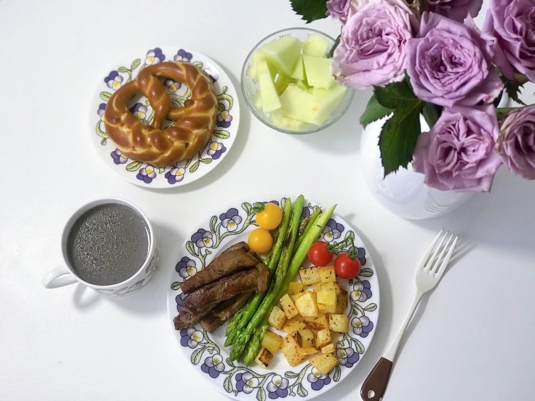碱水辫子包,香煎小土豆,牛排,芦笋,黑芝麻糊。