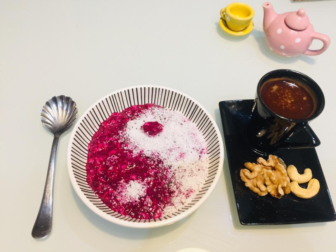 黑莓 红菜头打成汁➕奇亚籽 燕麦 枫糖搅拌均匀 放入冰箱 第二天淋上椰粉即可 不小心淋出...