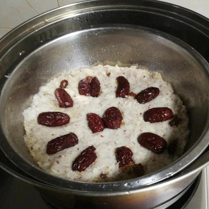 熟山药400克。糯米粉60克。芡实粉50克。白糖40克,牛奶100克。提子干枸杞少许,红枣6颗。(大份,不锈钢盆)