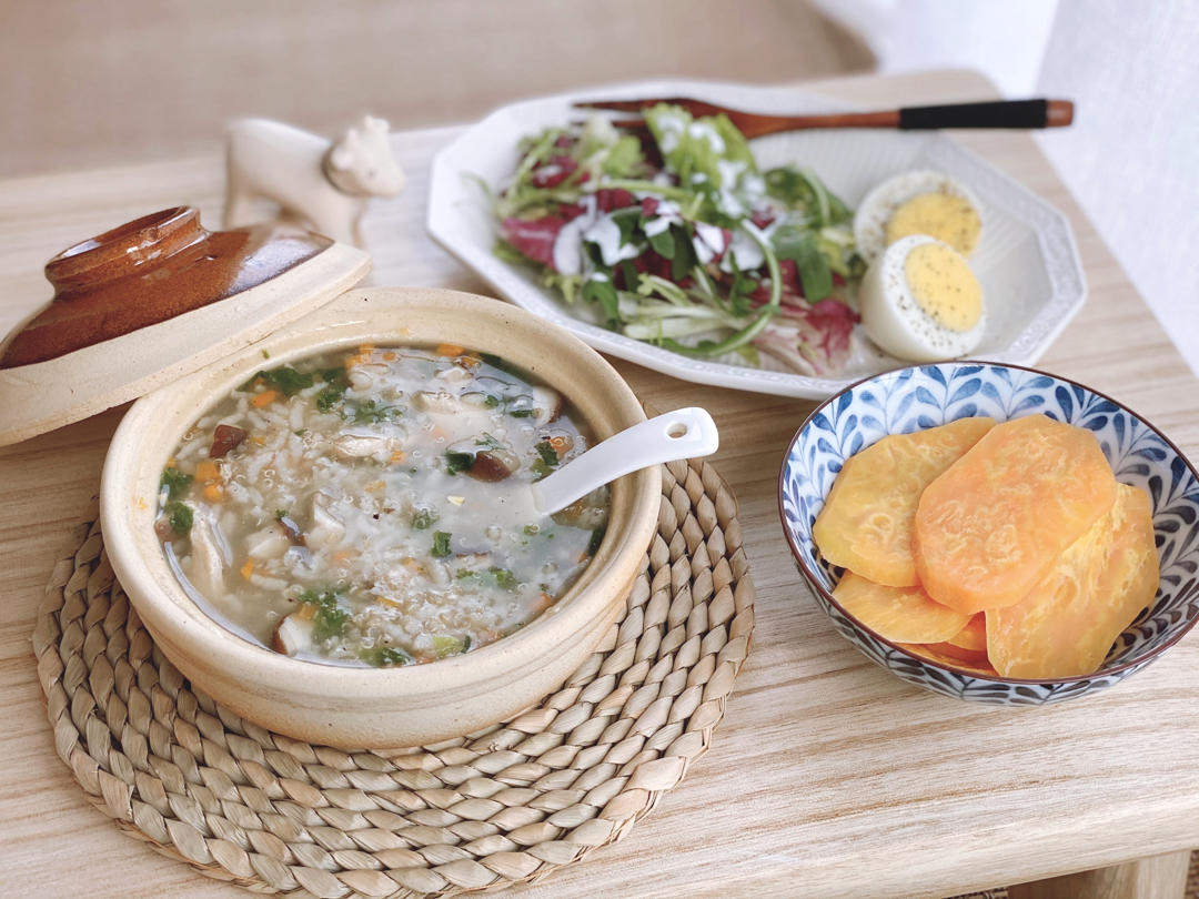 香菇鸡肉藜麦粥|蒸红薯|水煮蛋|沙拉🥗