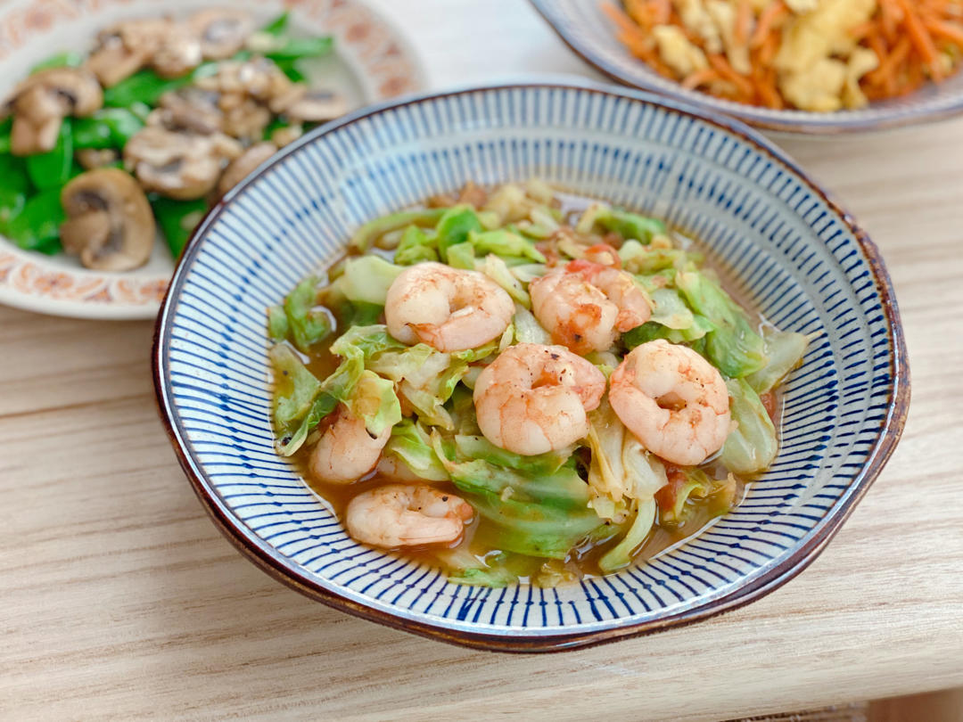 虾仁番茄圆白菜|蒜蓉口蘑荷兰豆|胡萝卜炒鸡蛋
