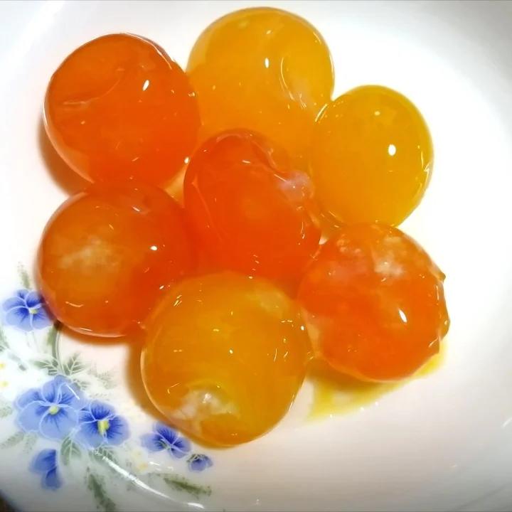 鸭蛋腌得不够多,老是浮起来,所以可能一块腌的咸鸭蛋出来的蛋黄有深有浅吧,蒸过一个出油了的,还不错