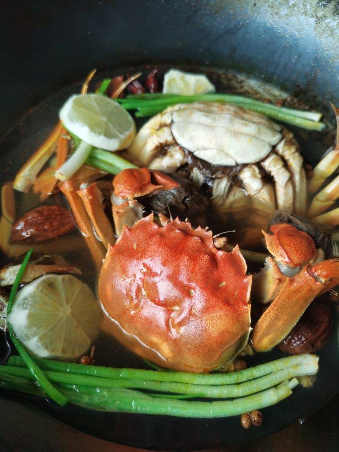 大闸蟹蒸后泡香料汤中10小时后再吃。香料有花雕,姜,八角,草果,花椒,桂皮,柠檬去籽