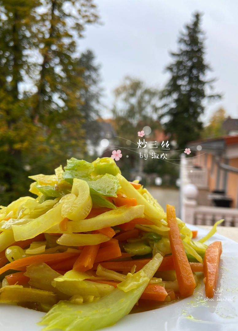 把冰箱的存菜炒一碟,半根胡萝卜,四分之一的包菜,一根芹菜