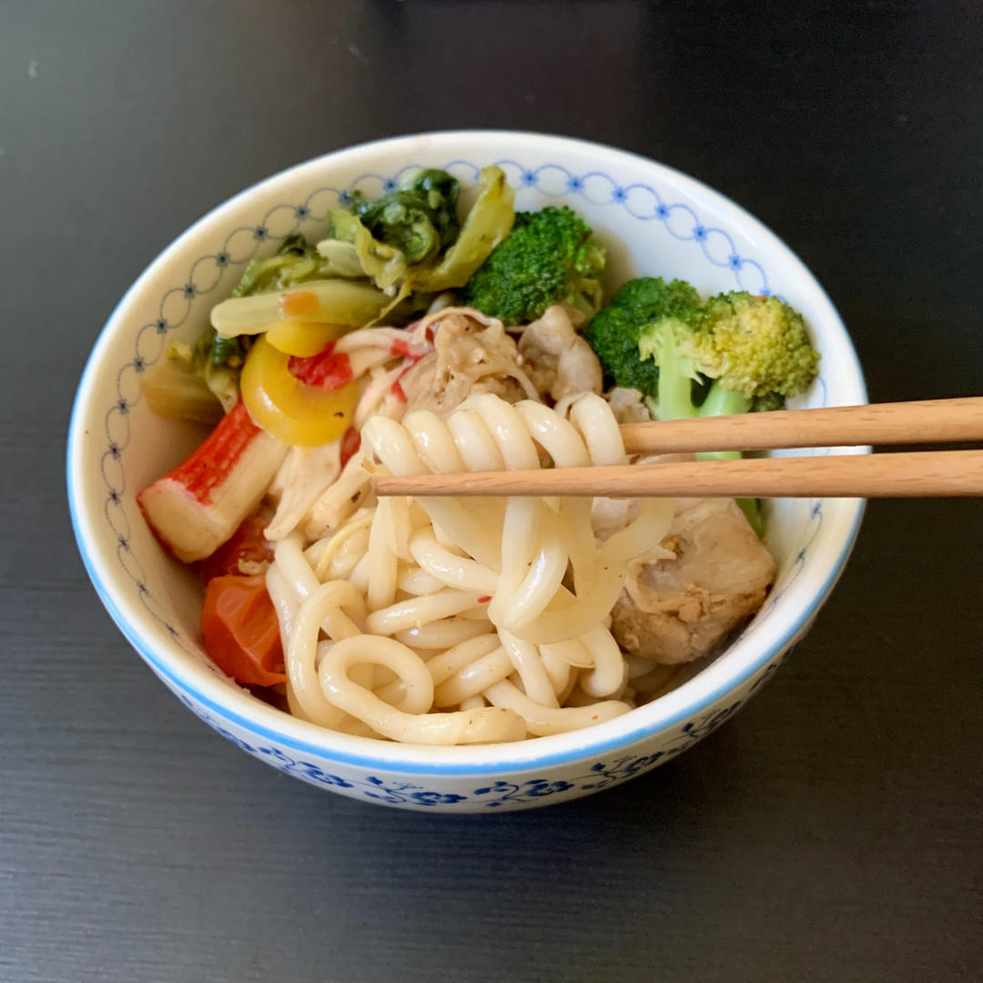 乌冬面里加了点火锅底料,味道就上来了hhh,为了拍照好看拍一碗,实际吃...
