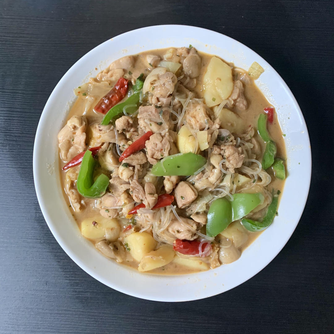 把鸡腿肉剔骨,然后和土豆洋葱蘑菇青椒一起炖,加了黄酒味道更好些~最后拌米粉吃了
