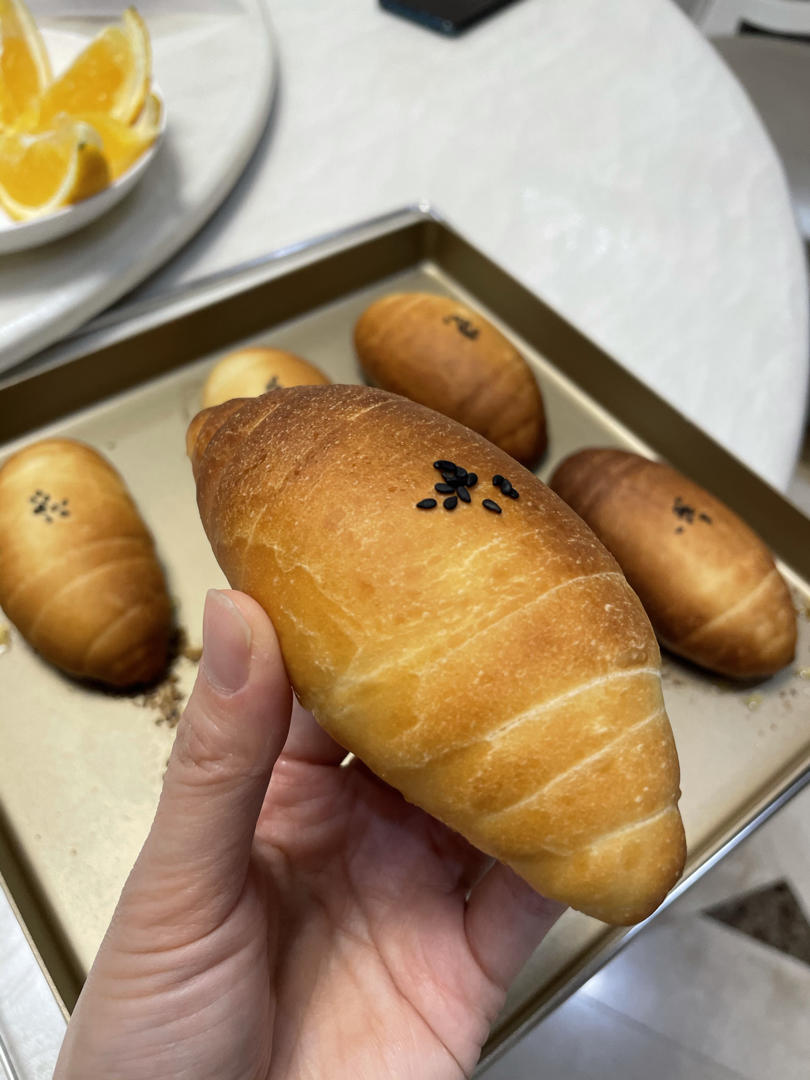 面团太湿了,揉不起来,后续又加了挺多面粉,做出来比up主的干。不过也很好吃,很松软。
