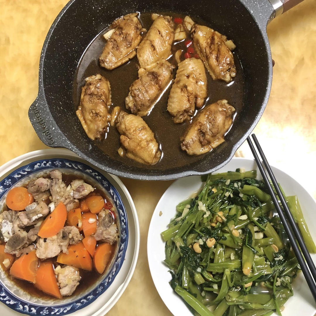 炒排骨,节瓜丸子汤,酱炒豆角丝,灼菜心