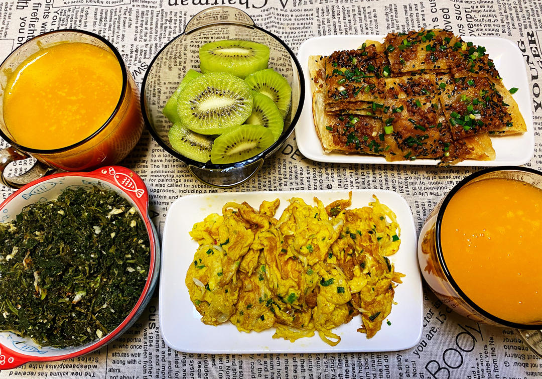 南瓜粥➕小银鱼炒鸡蛋➕炒蒸扫帚苗➕香葱肉沫饼➕猕猴桃🥝