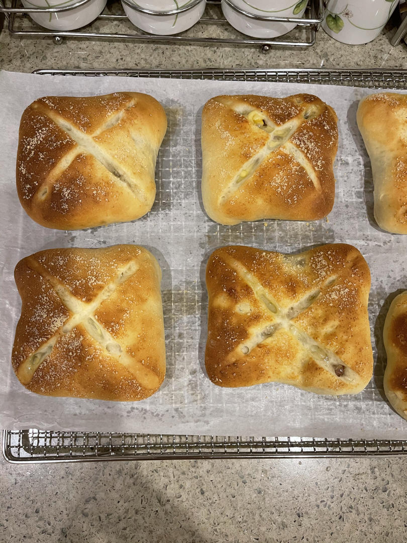 刚买了老师的课,就迫不及待的准备原材料,整形的不好看,第一次做咸口面包,做完后立马吃了一个,口味饱满,有层次,惊喜,面包...