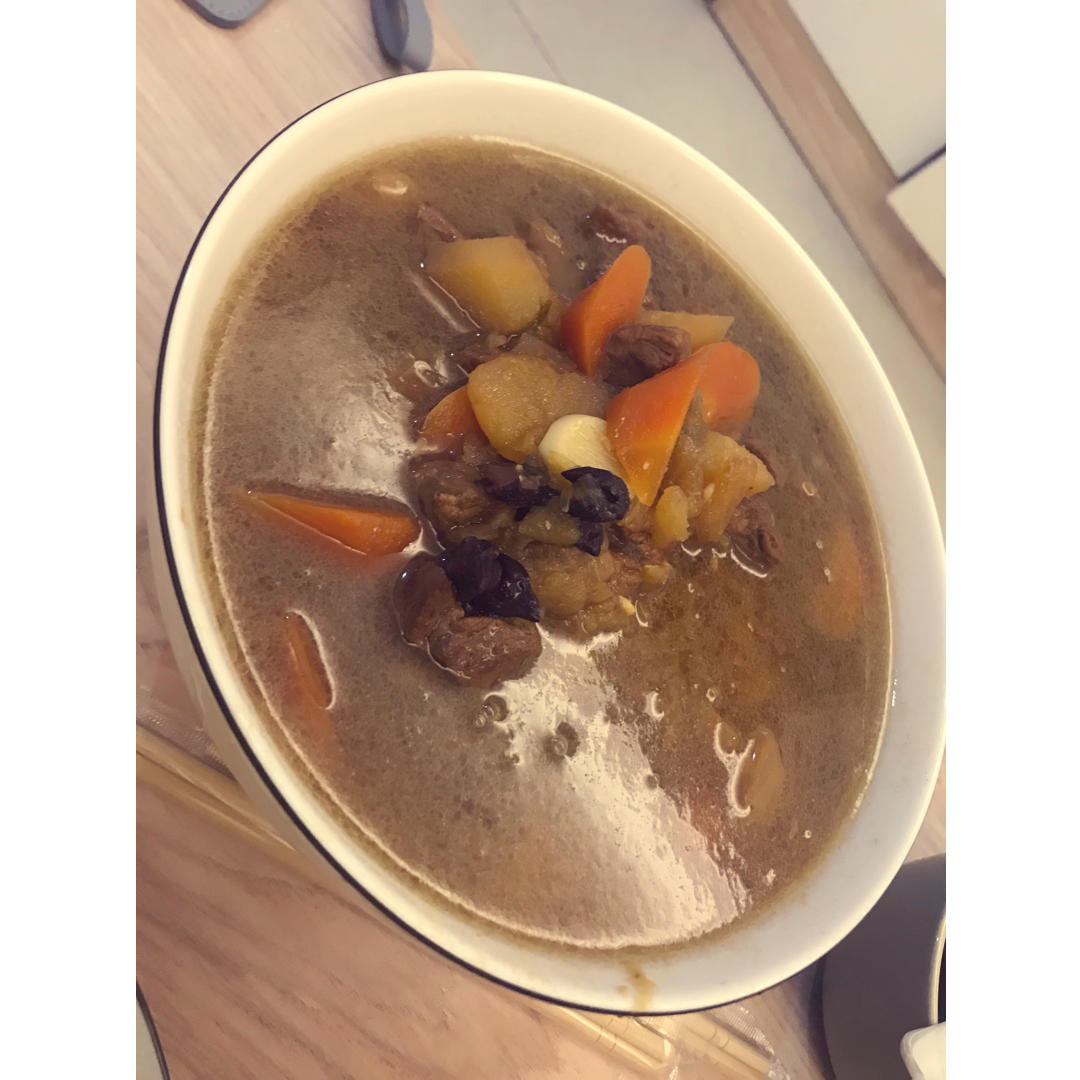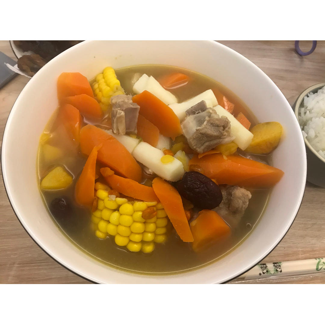 加了枸杞红枣蜜薯,喝起来甜甜的。排骨虽然颜色惨白,但是也好吃。比较健康。