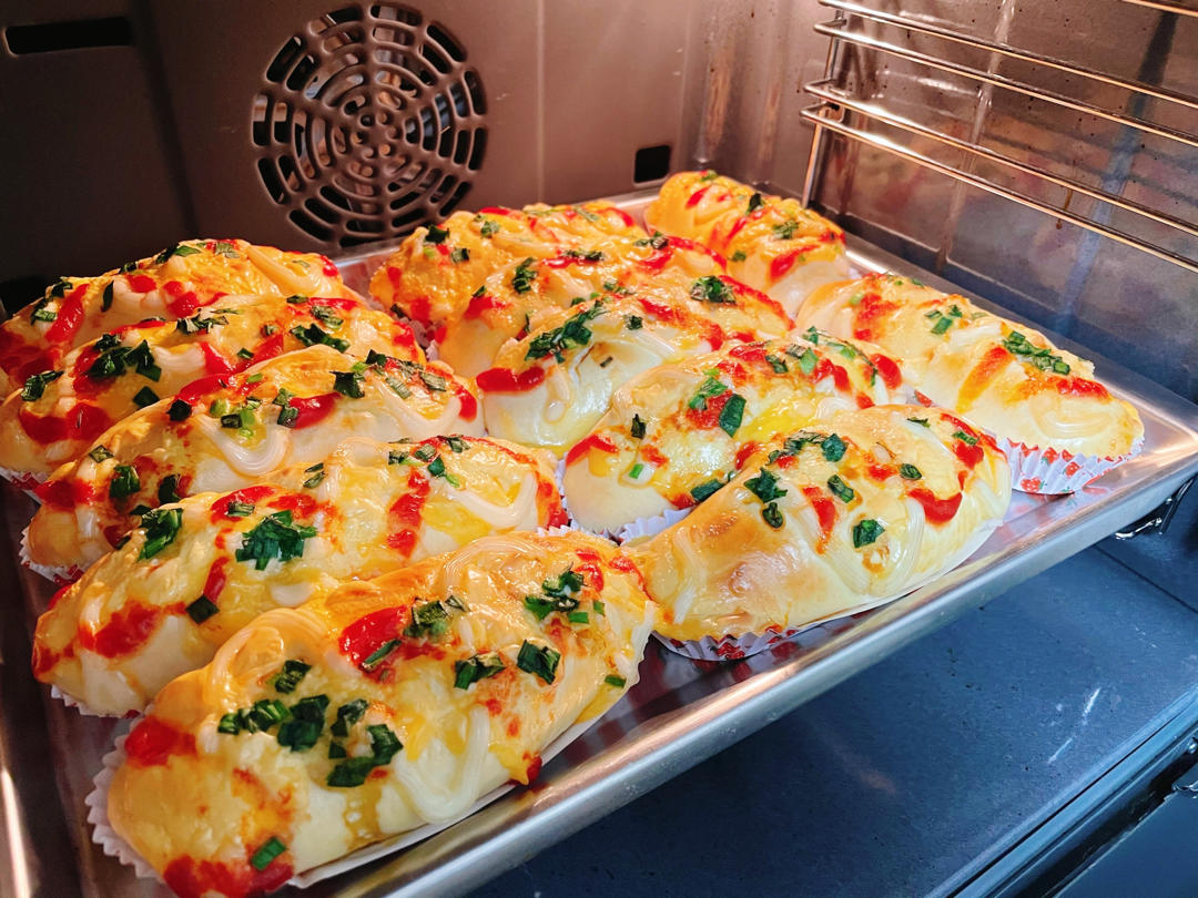 做了肉松和香肠夹馅,180度20分钟,完美。