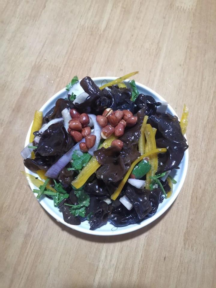 1、干木耳加面粉、加盐用水发泡洗净后用开水煮2至3分钟,控干水分备用;