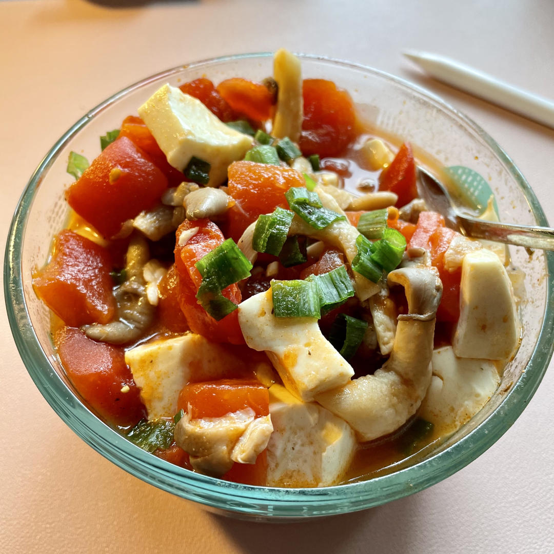 借汤的配料组合想做成小炒,结果平菇出水太多变成了番茄煮,不过比汤更鲜😋