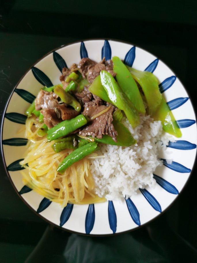 莴笋炒牛肉+豆角炒肉+肉醋溜土豆丝