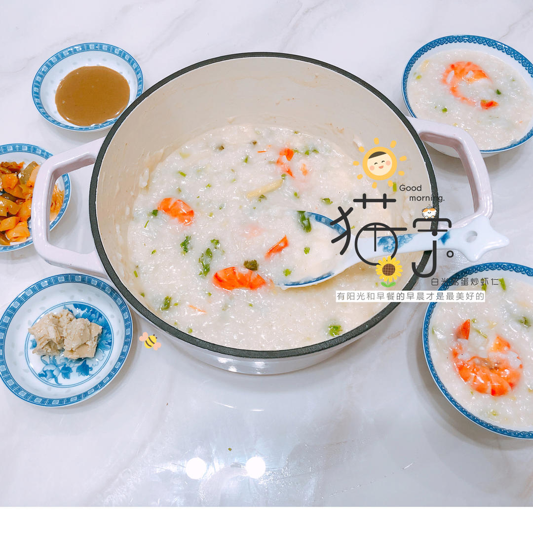 大米和水1:8.5的比例,大火煮开后就加入虾油和虾头一起煮,米煮开了之后还加了牛奶。开锅后加葱和香菜,调味的盐和白胡椒要...