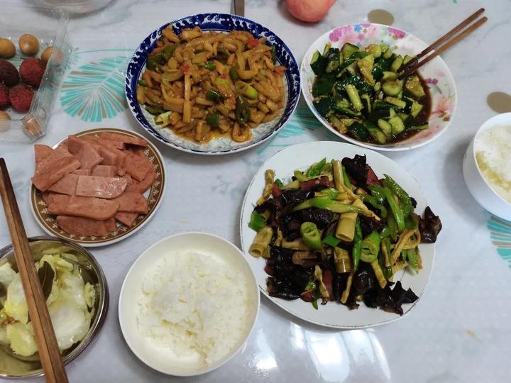 芦笋炒腊肉,红烧茄子,凉拌黄瓜,爽口泡菜