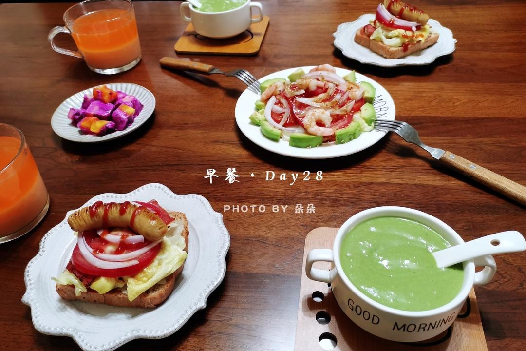 早餐:鸡肉脆皮肠三明治+牛油果鲜虾沙拉+抹茶牛油果香蕉奶昔+水果酸奶冻+高纤植物营养粉