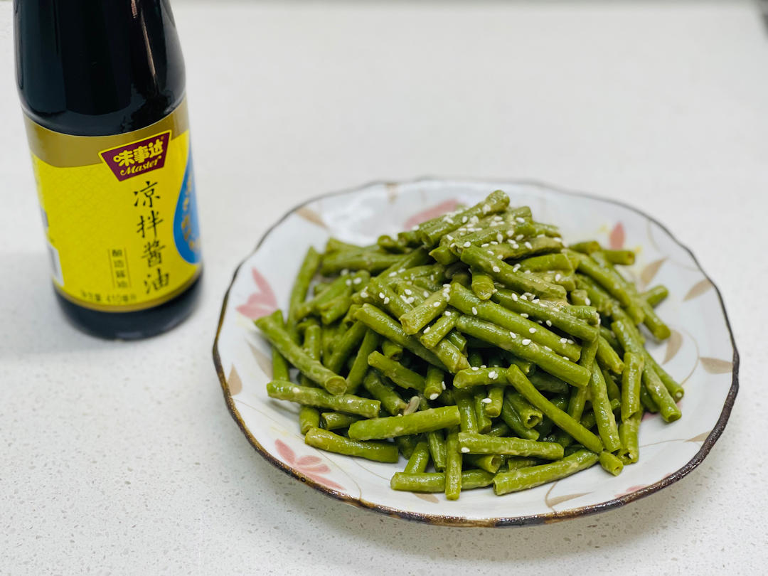 豇豆煮熟,加味事达凉拌酱油两勺拌匀,淋上芝麻酱。