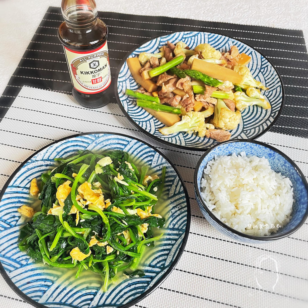 打卡午餐:菠菜炒鸡蛋、菜花芦笋炒肉(存图)😀