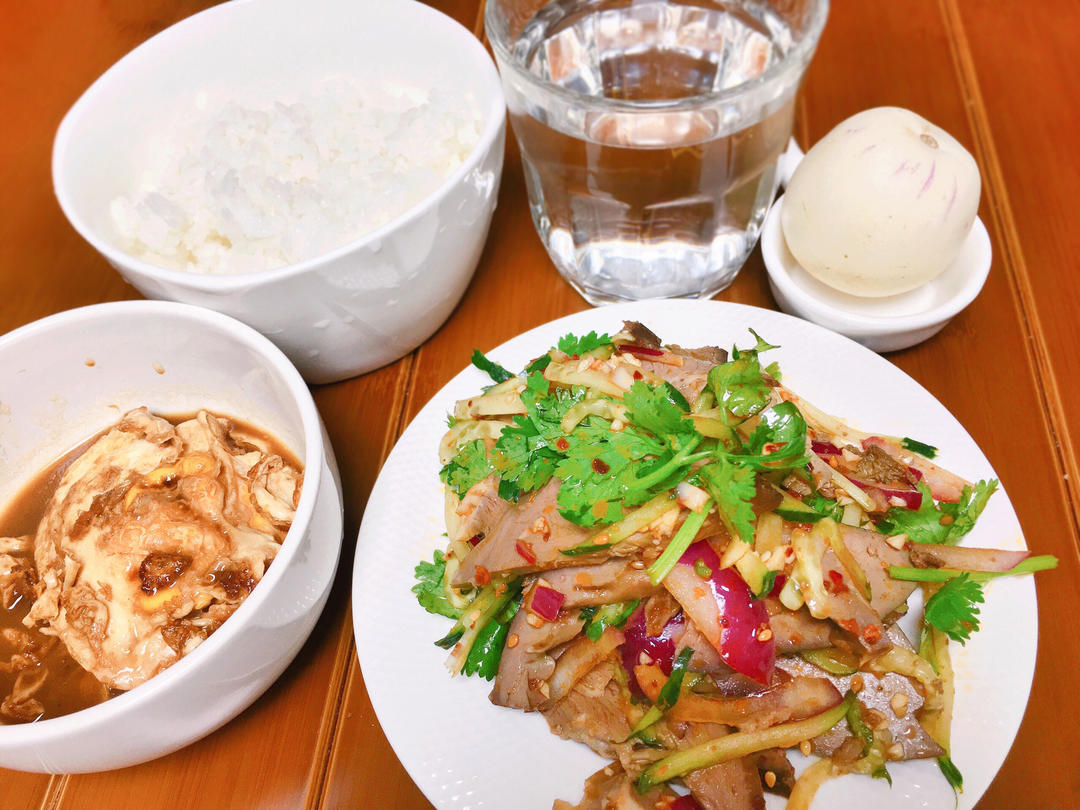 ❥凉拌猪杂 白米饭 糖醋蛋 人参果 水〉