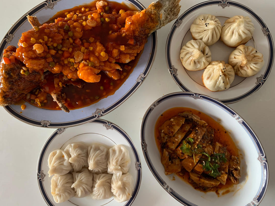 外卖点的松鼠鱼 口水鸡 生煎包 小笼包
