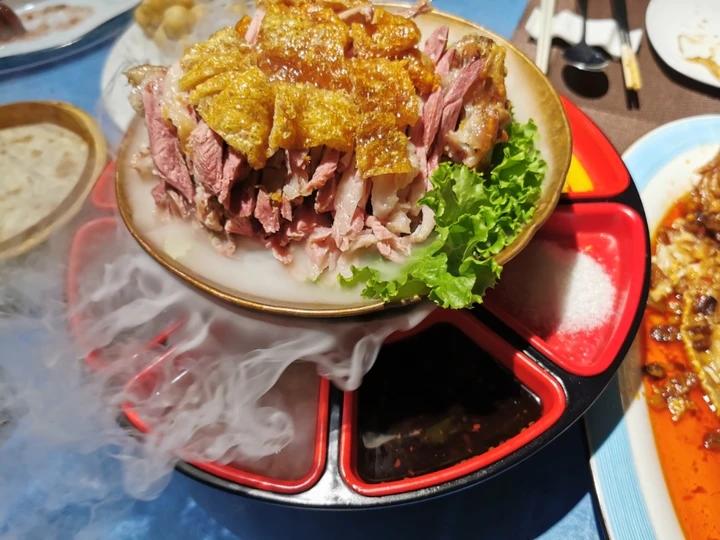 冒着仙气的黄金脆皮肘子,周围围了一圈甜面酱、砂糖、辣椒粉、京葱丝等蘸料配料,可以像烤鸭一样卷饼吃。
