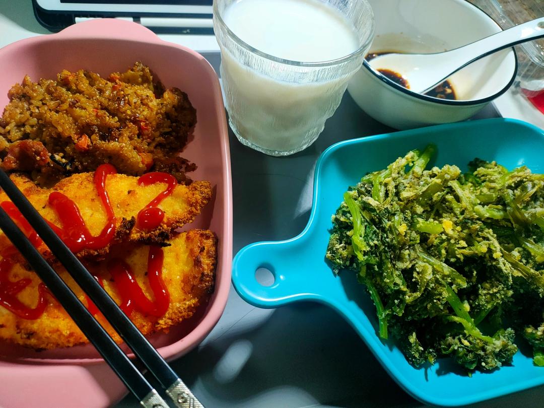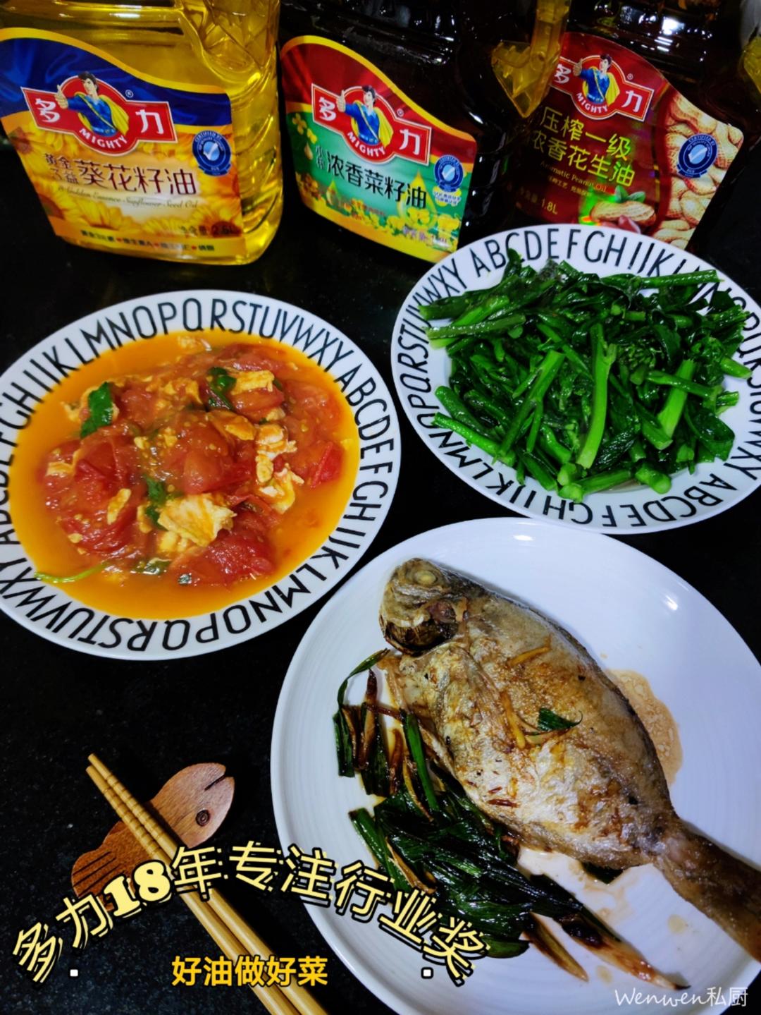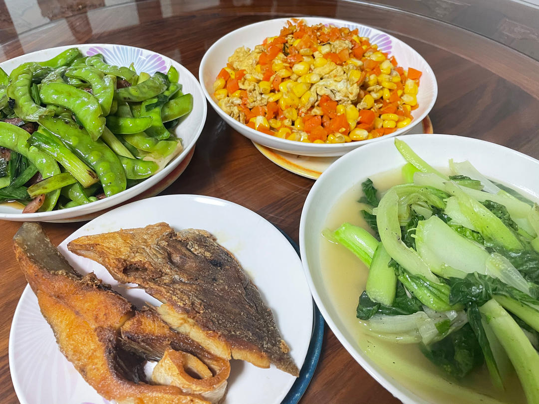 胡萝卜玉米炒鸡蛋🌽+炒小白菜🥬+煎鱼🐟+荷兰豆炒腊肠🥗+花旗参白鸽汤🕊