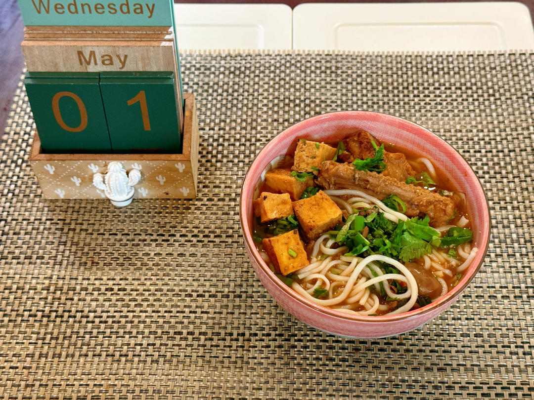 五二,早餐做了一碗地道的叉烧米粉,炸花生,黄豆粒,香菜葱花一样不落下,味道还不错!