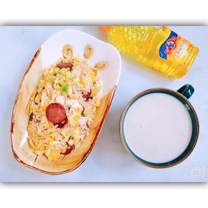 儿菜、腊肠、鸡蛋,有啥放啥的炒米饭✌ 再搭配一杯伊利植选燕麦奶✌ 一顿简单的午餐好了✌