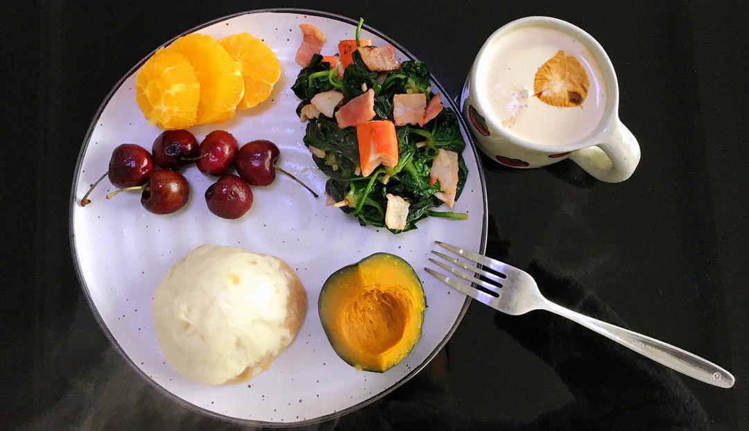 肉包,蒸南瓜,水果,菠菜培根蟹柳,拿铁。