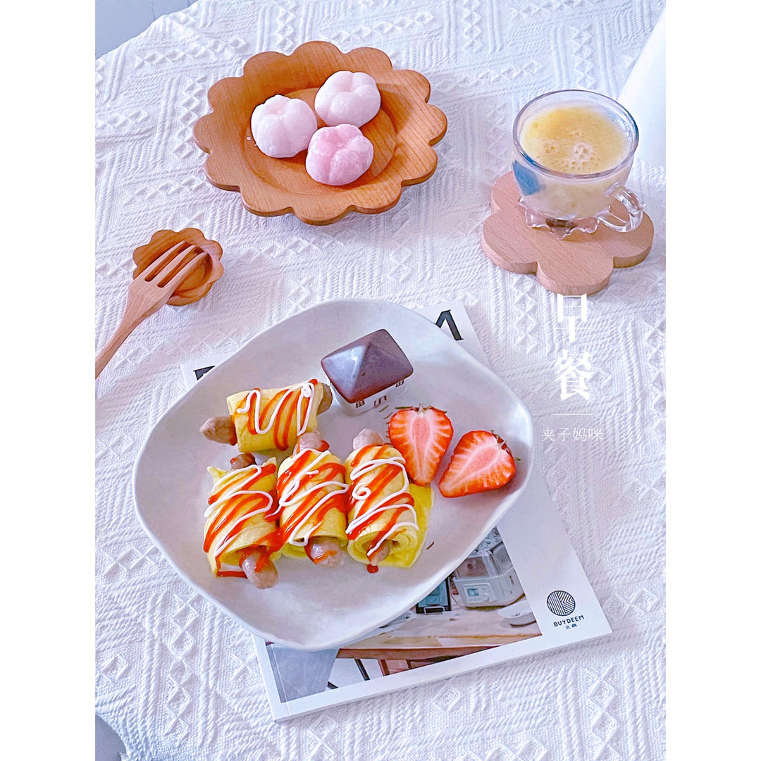 今日早餐有香肠鸡蛋卷,樱花麻糬,山药小米奶糊~,下厨房送的小房子餐盘,好喜欢~