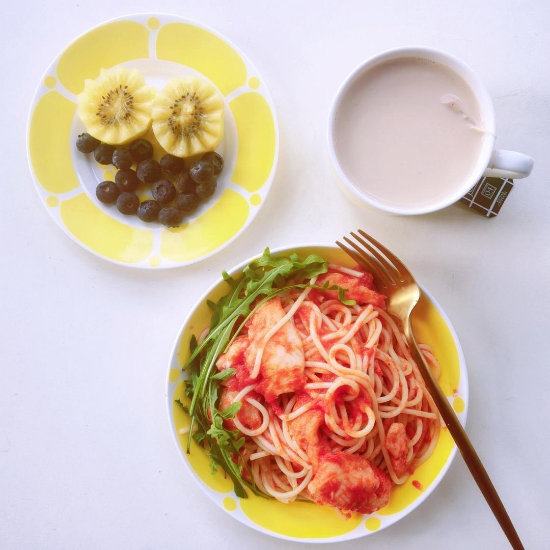 番茄龙利鱼意面,猕猴桃🥝蓝莓,奶茶