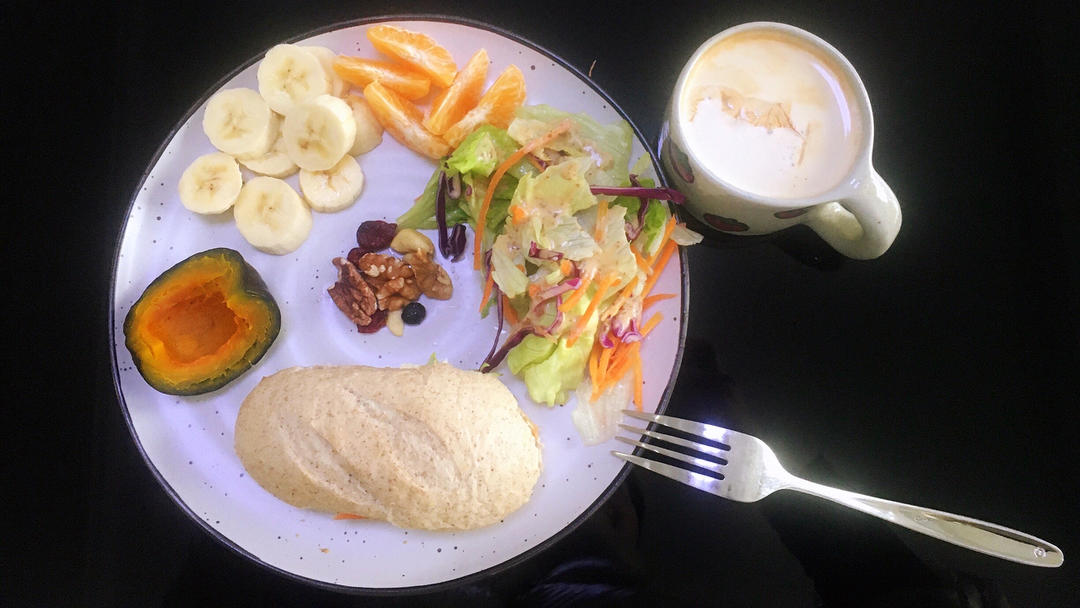 青稞全麦欧包三明治,蒸南瓜,水果,无盐坚果,蔬菜沙拉,拿铁。