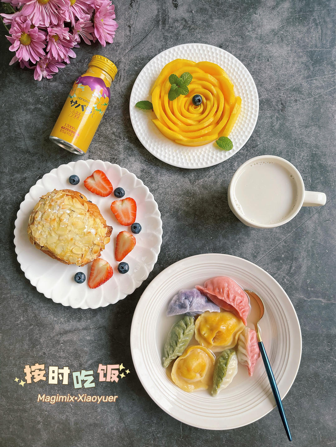 周五早餐:彩色水饺🥟、巧克力可颂🥐草莓🍓蓝莓🫐玫瑰花芒果🥭、沙棘汁🍹、花生燕麦奶🥜。二月二...