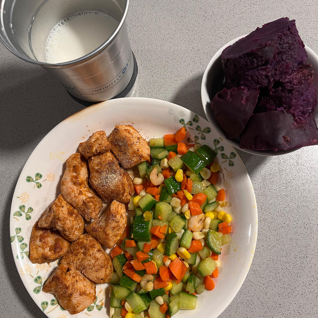 胡萝卜黄瓜玉米虾仁 煎鸡肉 紫薯