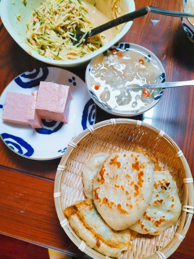 鸡肉油麦菜馅饼,午餐肉,银耳汤