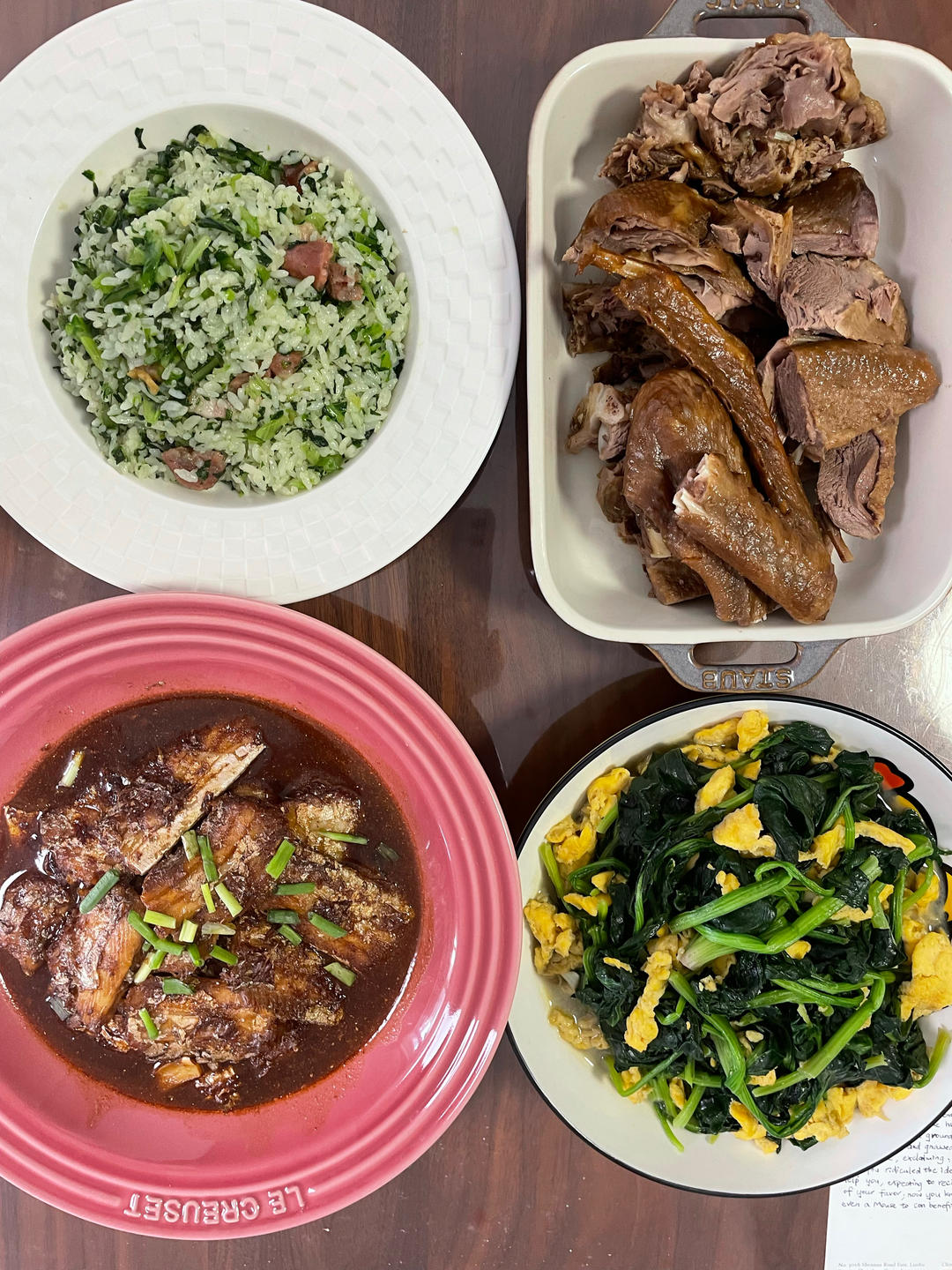 红烧带鱼,莴笋叶菜饭,卤水鹅,菠菜炒蛋