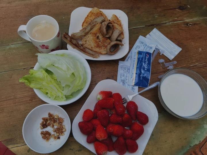 早餐:牛奶+全麦吐司+油煎德式肠+生菜+草莓+核桃仁+粽子(还没拍照已进家属胃里😳)