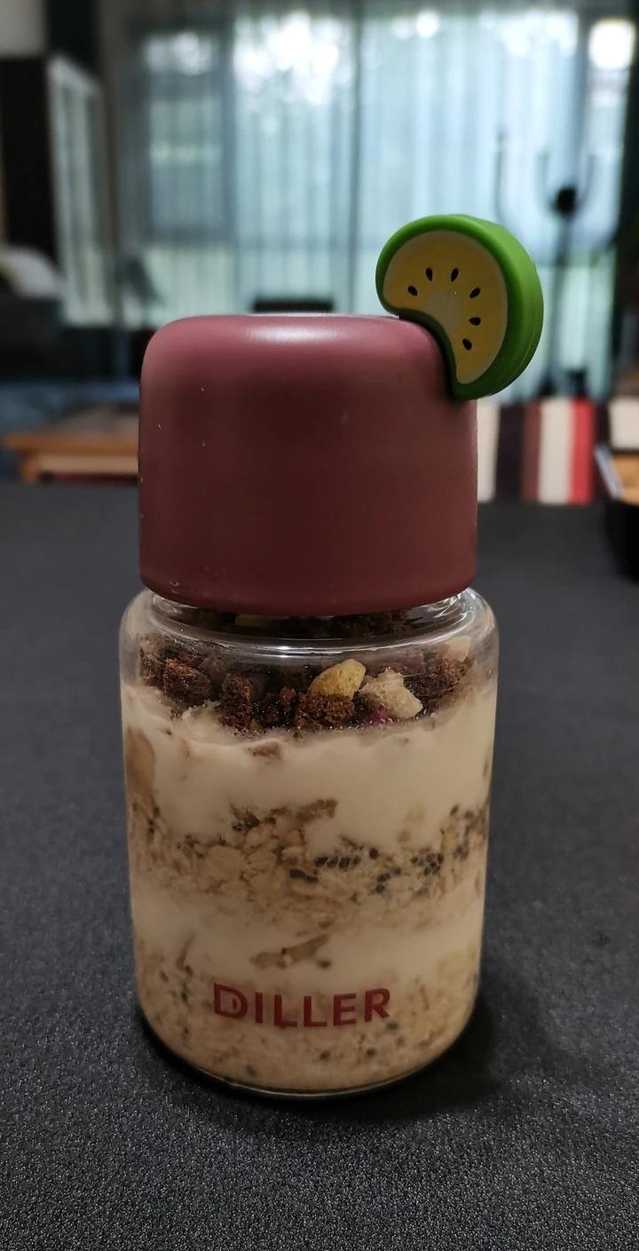 从下到上的顺序:燕麦 奇亚籽 牛奶+咖啡/可可粉或液 香蕉 酸奶(重复以上加一层) 坚果碎 谷物脆(这个早上吃的时候再放...
