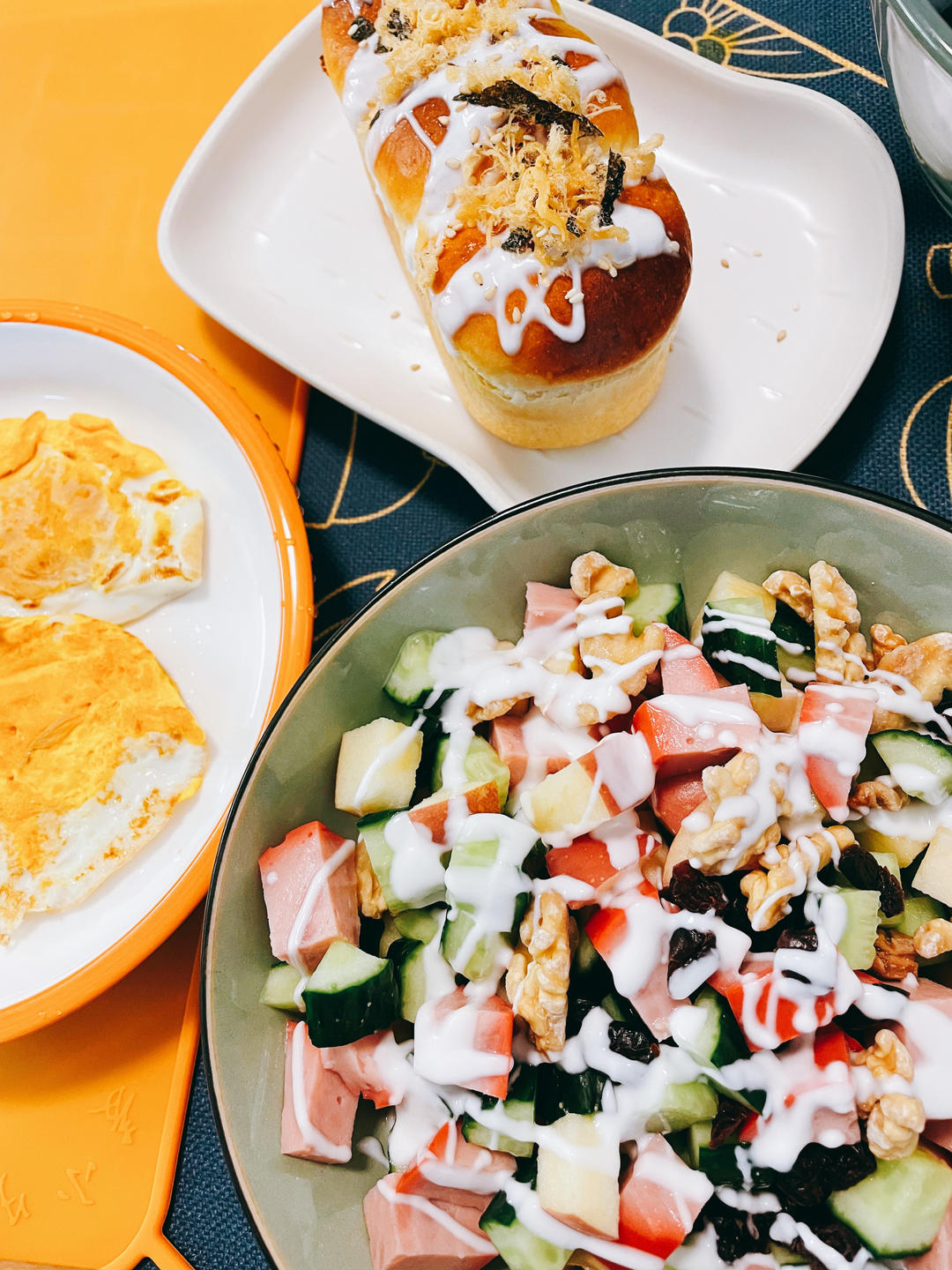 芝士鸡肉肠浴缸小面包,华尔道夫酸奶沙拉,煎蛋,赏心悦目~