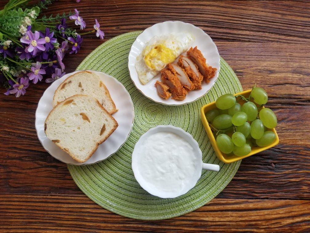 酸奶🥛+果子面包🍞+煎鸡蛋🥚+鸡排🐥+青提🍇