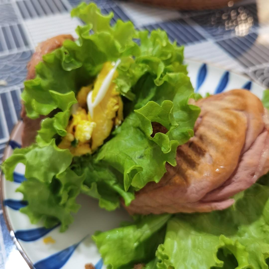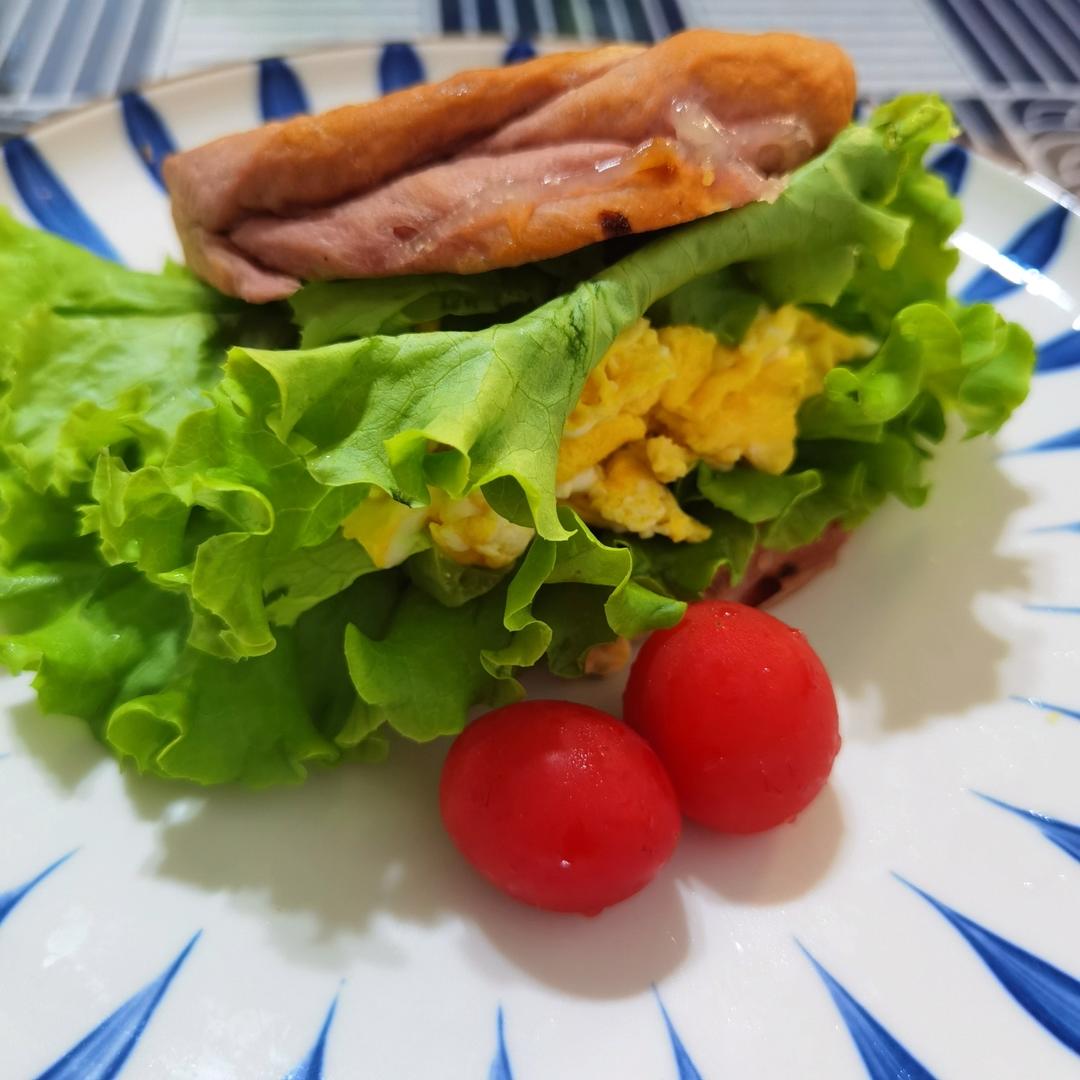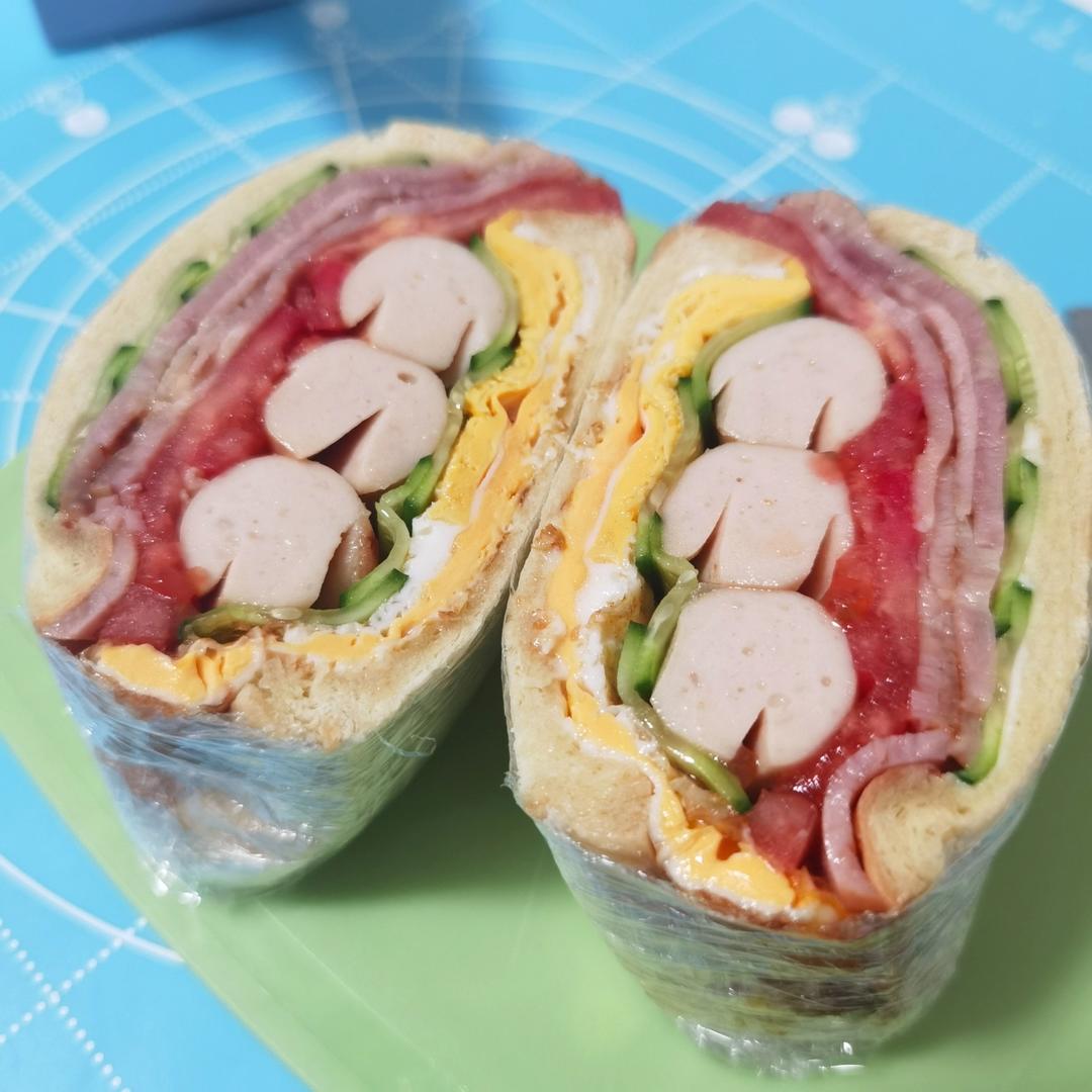 ⏳25天,早餐准备一份,超大号的三明治,自制用料很随性。黄瓜4片,西红柿3片,鸡肉肠3根,煎蛋2个,培根2片,面包2片,...