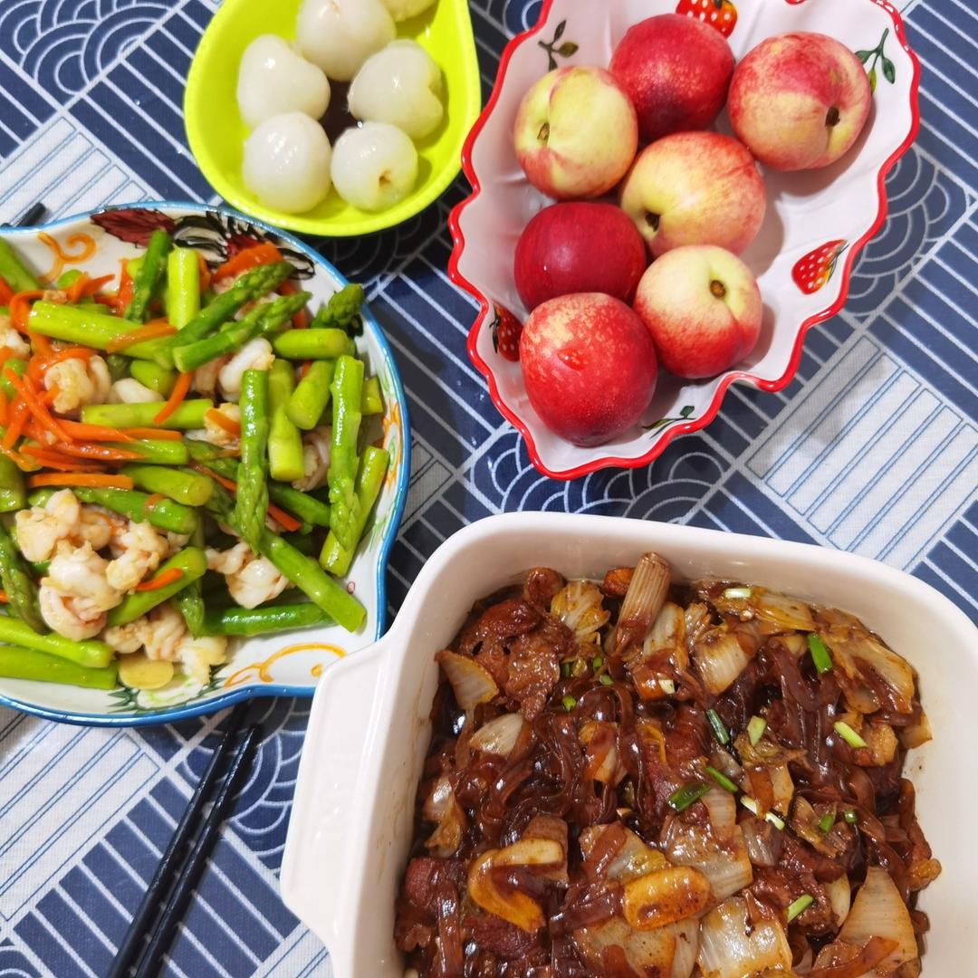 午餐,多雨又降温,昨天最高29℃,今天最低12℃,这温差😱,白菜猪肉炖粉条,芦笋炒虾仁,水果是隔壁美邻送的桃(桃子的味道...