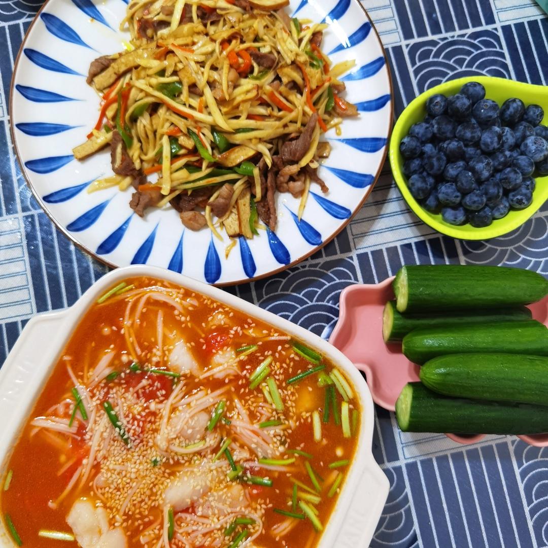 简餐,午餐,天突然变热,吃点酸酸甜甜的口味,胃口开了心情好了。番茄巴沙鱼,茭白炒肉丝,黄瓜,水果#午餐•2022年5月1...
