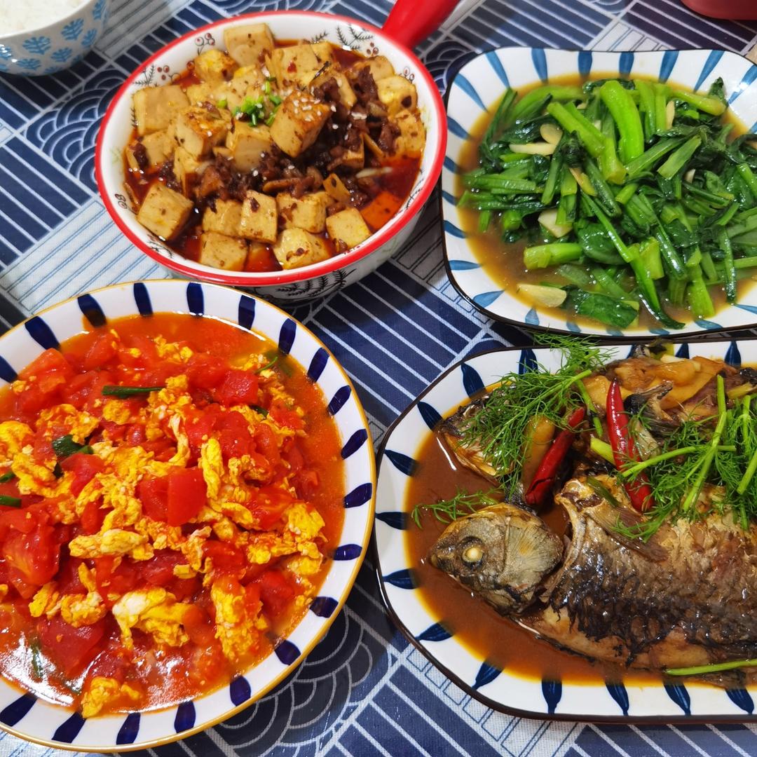⏳23天,红烧鱼,西红柿炒鸡蛋,肉沫豆腐,耗油菜心,水果。忙碌的周末