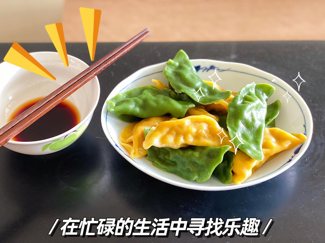 买的南瓜、菠菜饺子皮,自己拌的猪肉胡萝卜包菜馅,还不错😌