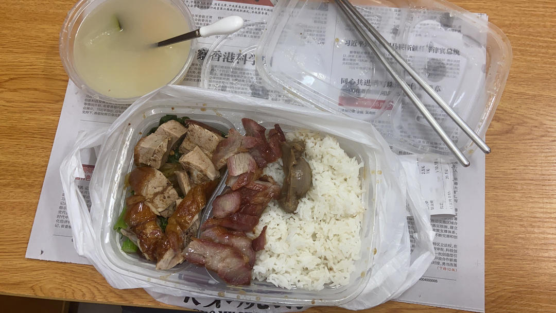 值班吃盒饭。太难吃了