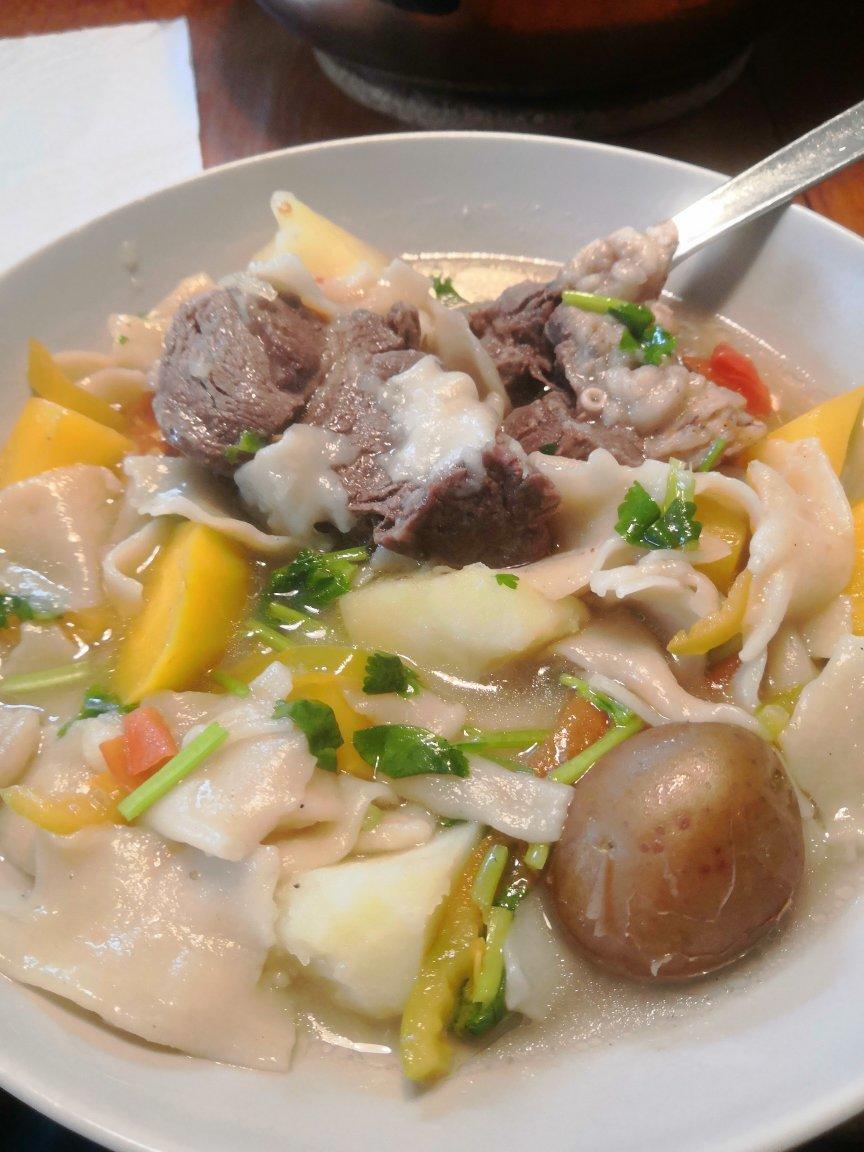 特克斯羊肉汤饭、牛肉炒野山菌、凉拌豆角和清炖羊肉